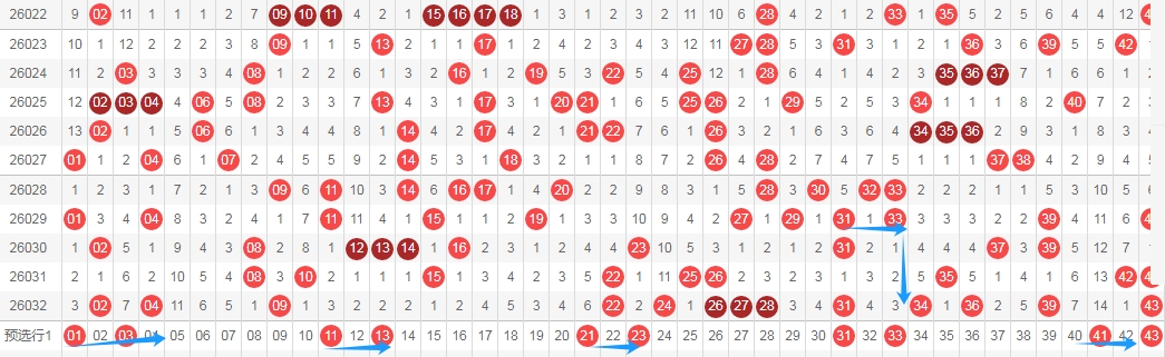 上图是福彩快乐8开奖号码走势分布图其中一部分走势图,这个区域的数字是从01到43,我在上面走势图中标注出来的数字都是1尾数数字和3尾数数字组成的跨度二组合,一共是5组,这些跨度二组合有0103 1113 2123 3133 4143这些跨度二组合一共连续3期没出现,这些组合最近十几期也没出现过几组,经常关注福彩快乐8的朋友应该知道,福彩快乐8开出的跨度二组合是比较多的,那么本期可以关注这些跨度二组合出一组或两组,个人最看好1113 2123