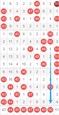 上图是福彩快乐8开奖号码走势分布图其中一部分走势图,这个区域的数字是从44到51,这个区域的数字一共有8个,这8个数字出连号一共连续8期没出现,这个区域的连号组合有4445 4546 4647 4748 4849 4950一共有6组连号,那么本期可以关注这些连号组合出一组或者两组,个人最看好4546 4748 4950。