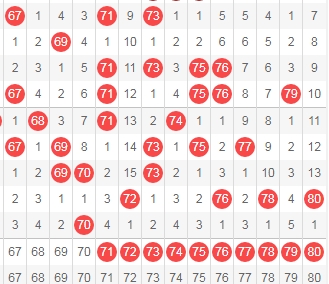 上图是福彩快乐8开奖号码走势分布图其中一部分走势图,这个区域的数字是从71到80,这个区域的数字一共有10个,这10个数字上期是一个都没出现,那么本期关注这个区域的数字出2个或者3个吧,个人最看好数字74 77 79 80。