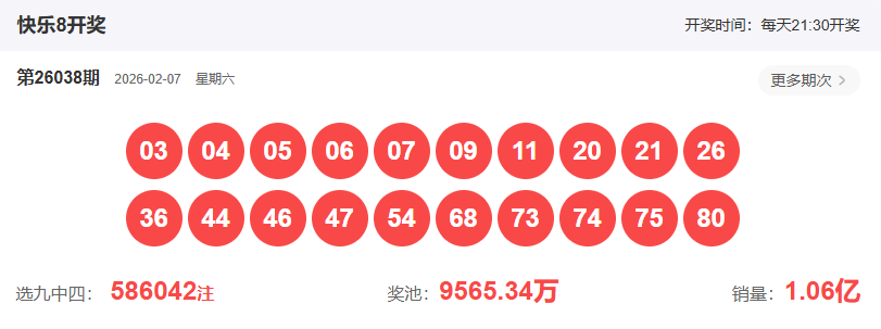 首先我们看下上期开奖结果,快乐8第26038期开奖结果:03 04 05 06 07 09 11 20 21 26 36 44 46 47 54 68 73 74 75 80,和值为:709,大小比11:9,四区8:3:4:5,出了两组两连号,分别是:20+21,46+47, 开出一组三连号:73+74+75,开出一组五连号:03+04+05+06+07, 直连重号出了2个,分别是:06,07,均为两连重号,我们把01-40分为前区,41-80分为后区, 则上期小号居多, 未开出冷号,均为热号和温热号。