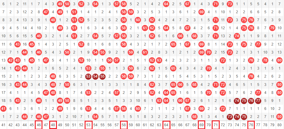 接下来我们一起看走势图,我们把01-40分为前区,41-80分为后区。