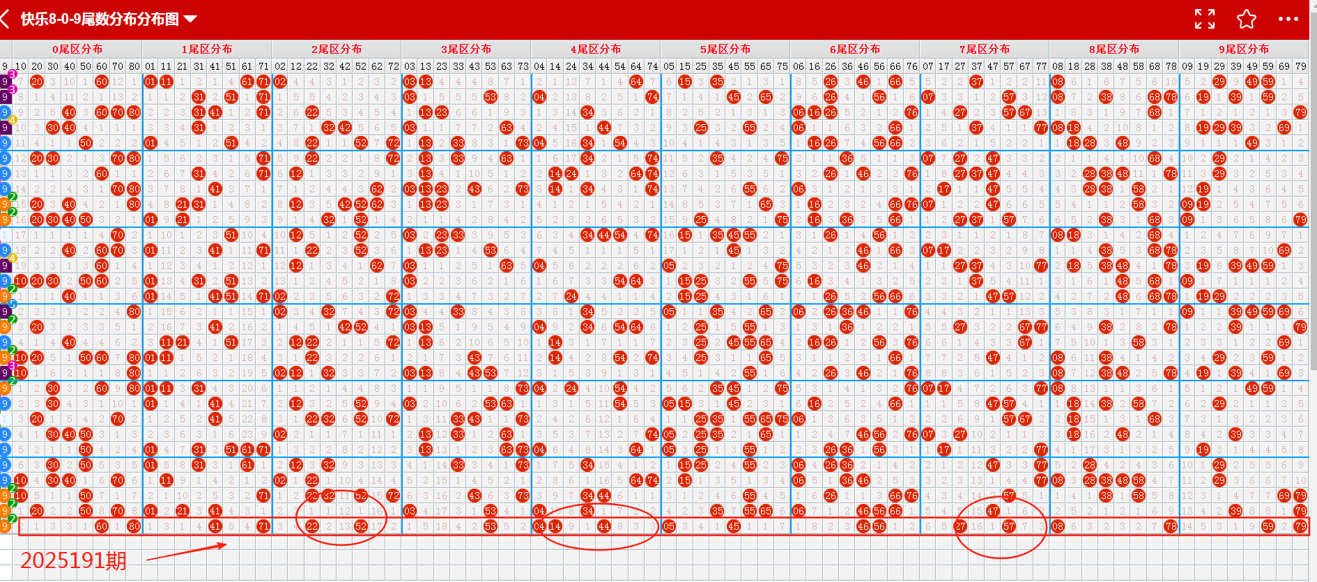 上图是快乐八2025191期的尾码走势图,从图中看0尾到9尾出号个数依次是:0尾号码区开出2个;1尾号码区开出2个;2尾号码区开出2个;3尾号码区开出1个;4尾号码区开出3个;5尾号码区开出2个;6尾号码区开出2个;7尾号码区开出2个;8尾号码区开出2个;9尾号码区开出2个;再看小尾号码(0尾-4尾)区有10码,大尾号有10码;数据比对统计后可以看到4尾出号数量最多,开出了3个中奖号码。本期没有出现断区!由走势比对推断20250192期重点需要关注2、4、7尾区号码下号热度和增加的概率较大。