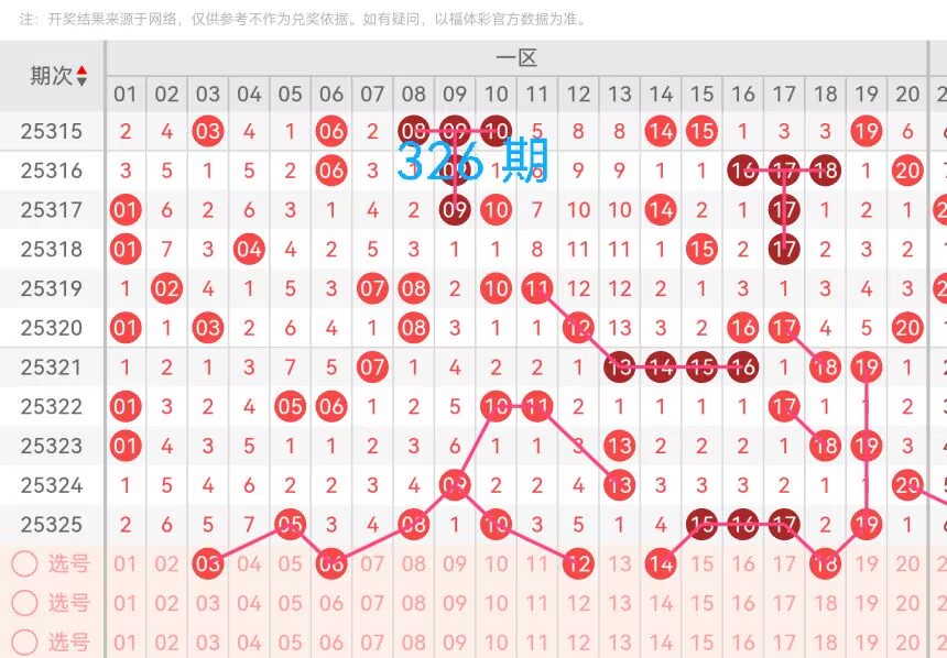 01-20区间,上期开出7个号码(05 08 10 15 16 17 19),重点号码06,在近30期内出现7次,属于高频热号,且其周边号码05、07在历史同期开奖中频繁伴随出现,形成稳定出号集群;12作为1-20区间的中轴号码,且常与11、13组成连号;18在近30期内出号分布均匀,与25324期开出的20形成跨度为2的邻号关系,邻号跟进概率较高。备用号码03,作为012路中的0路号码,近期0路号码在该区间出号占比上升,其历史出号后重复或邻号开出的概率较高;14作为偶数代表,可平衡区间奇偶比例,尾数热度较高。因此综合推荐该区间号码【03 06 12 14 18】