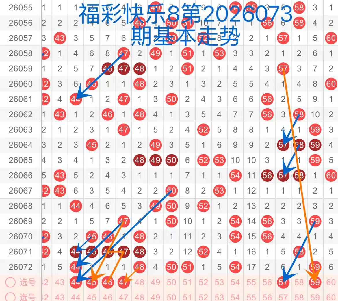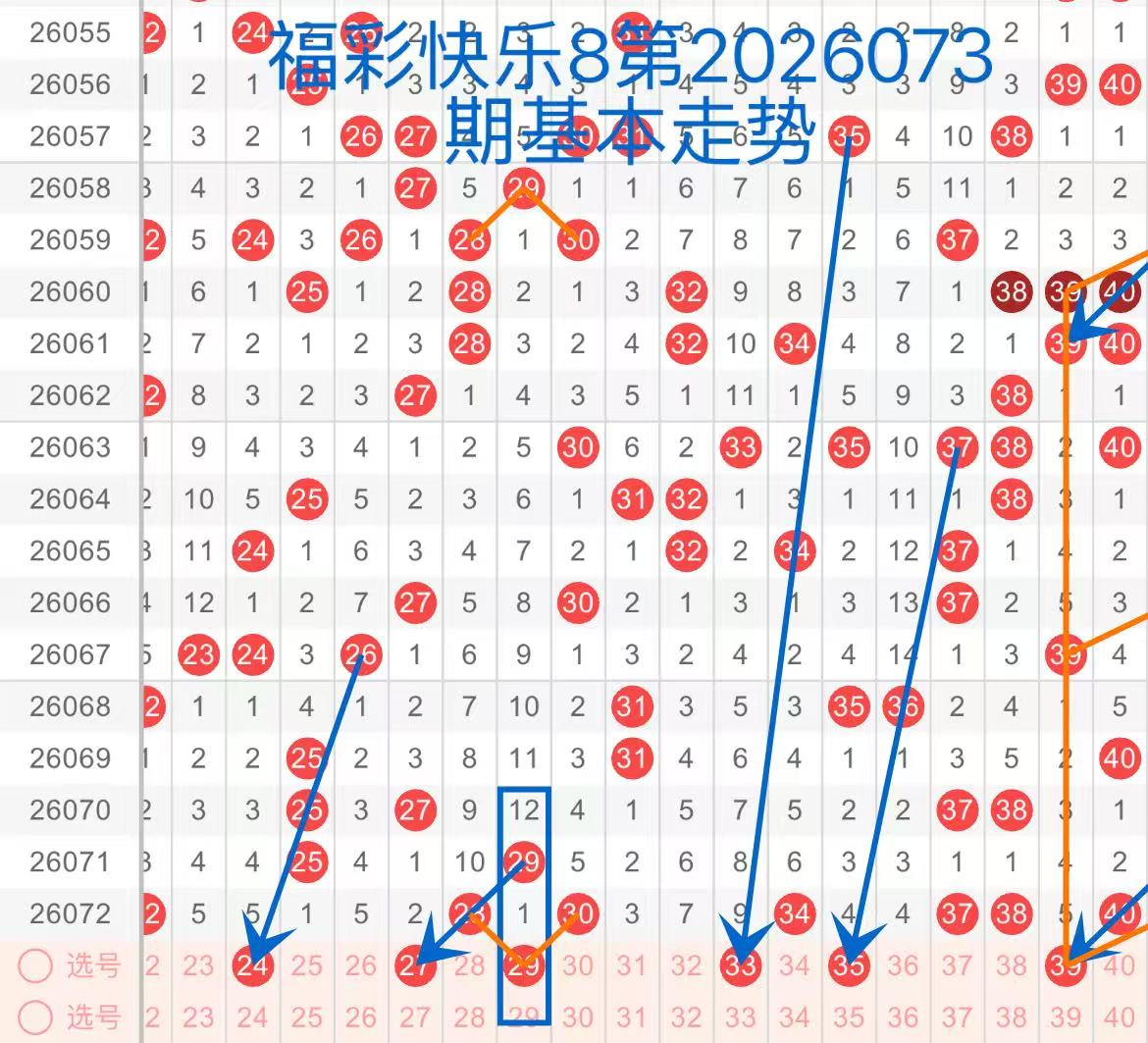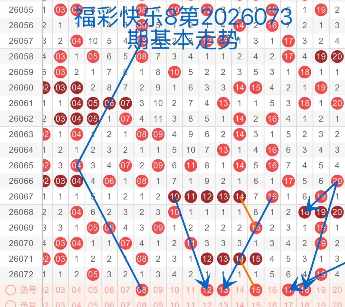 下面是我对2026073期福彩快乐8的分析和预判,希望通过我的分析能让大家今晚大满贯!福彩快乐8上期开奖号码如下图