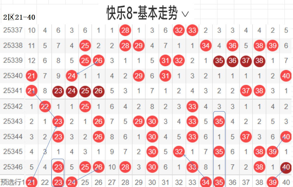 二区(21-40):遗漏5期以下有16个,0码23 25 26 28 30 33 38 40 8个,数据所示,冷码平均,选择条件增多了.上期开出了8个号码,出码比较分散.这期布防相应增加,重码按比例落这区较少,先给出关联码,这个区间间接走势,温区,21-30区间上期开了5个,依旧不是重点选号区间,31-40区间开出3个,本期关注热码的回补,间隔小遗漏值最佳,3字头转热,这个小区热码注意回调,可以做关联码的布局,注重温冷码的回补.