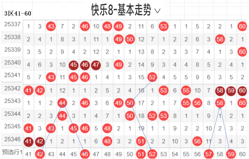 三区(41-60):遗漏5期以下有17码,0码41 42 48 51 56 5个,温开方式,这区码数有回暖之意,可以防一手,先定胆码走势较大者,隔期,斜三连,分边号码,可重防,间隔5期以上号码可以随走势选取,例如本期大冷码,走势比较大,可以做胆,通常联动可带出,分边对称的号码,本区间也有很大走势.可关注下.隐形夹角号码.做补位形态号码.都需要观察动态走势.以上是本区间的选码方法.