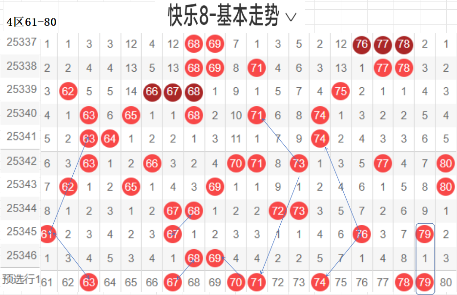 四区:(61-80):遗漏5期(含5)以下有18码,0码68 69 2个,平均温开方式,上期开出2码,区间回暖,后区可防,四区间从以往数据来看,重码很强,一枝独秀的存在,近期有回补走热的趋势,区间回暖后,本区间后区可防,与一区相比,也是温区.,对称下落码,隔期回补码,可以防守,这区对呈对称三角关系的胆码,斜三连有走势的胆码,联动落位码,都有各自的走向落位关系,根据走势选择一种方式选码.