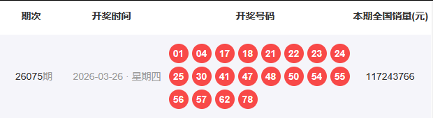 1、开奖号码:01 04 17 18 21 22 23 24 25 30 41 47 48 50 54 55 56 57 62 78