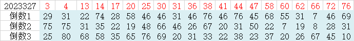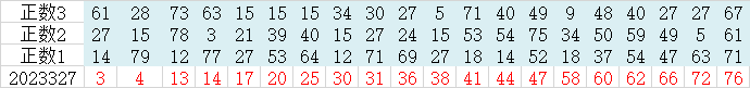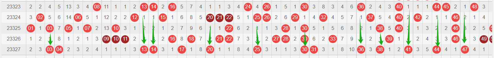 我感觉选热的同时,还要注意防冷条件开出,可以直接选取每个号码跟随出次前三的号码,也可以考虑把出次最后的三个数字加进去,不过这样可能号码太多,可以尝试。图上也能看出单独号码跟随的情况,我就不一一统计每个号码的出次了,我这里考虑提高概率,取每个号码历史跟随的前三号码和后三号码,根据2023327期的号码,我关注正数3和倒数3的号码号码为: