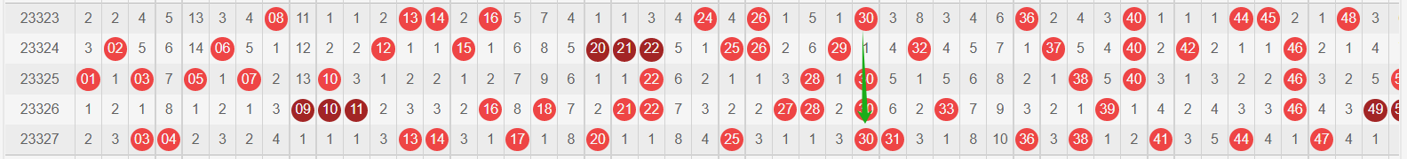 可以看出,每一组对应号码两两差值为40。这一组对数在2023327期开出2个。