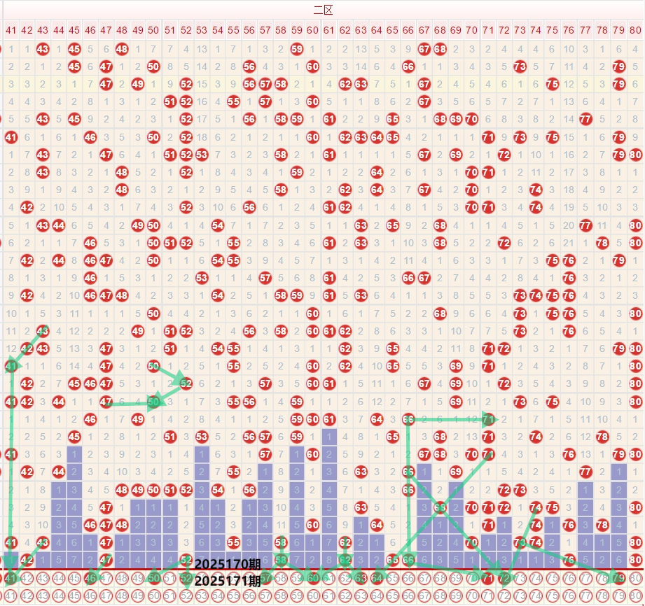 如图所示:在本期大数区的选号中注意在上期的走势中三区间开出了4枚中奖号码,区间的落号分布形态非常的分散,42 47 52 58,从上期的三区间落号分布来看本期要注意三区间的落号数量出现幅度较大的上涨走势,本期看好落位在6枚或者是6枚以上的数量,在上期开出47号的重号四期走势之后本期注意边号的走势,以及在上期开出58 62的下方注意号码的选择,四区间的号码注意63 64的夹二连走势,以及71 72位置开出号码,尾部位置注意79号的同路第三期走势。