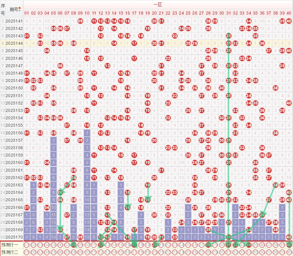 如图所示:在本期小数区的选号中,注意在上期的走势中一区间开出了7枚中奖号码,连续两期保持均值以上的走势,上期开出7枚中奖号码的小高位走势,本期注意二期下调的走势,本期注意01 20的近期交替走势,建议在01 20作为二选一考虑,另外在本期一区间的选号中要注意遗漏一期的号码选择03 06 14 17,从目前一区间的走势来看,个人较为看好1字头的号码,建议在14 17的位置选择一个,二区间上期开出四枚中奖号码,同时开出21 40的龙头凤尾走势,中段号码依旧是保持了31号的热码走势,本期注意31号的重号走势,或者是边号的选择30 32二选一,如果考虑31号走重注意28 31 34的同路三码走势。