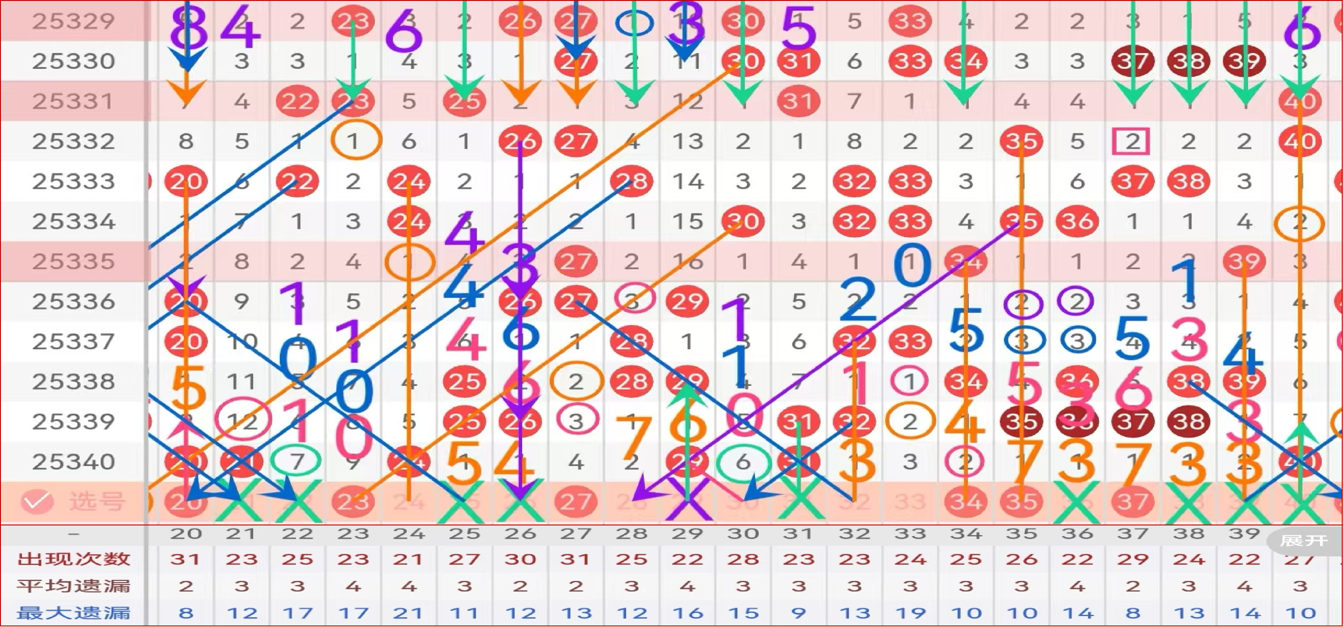 二区间上期开出了5个号码球,均值开出;三斜连的23,第二次走遗漏9,第八次走分边属性码,不错的回补码,可带上24连号防守,二择一主做推荐23;高数据27,第三次走遗漏4点位,热态码,本期可考虑重点回补;大遗漏值的28,鉴于分边属性较低,此号码本期考虑主防做号思路;二区间中部没有心仪号码球;34 35本期可考虑连号主防,做其遗漏值及遗漏对称形态;37是本期的规律码,第八次走遗漏1点位,可考虑主做;尾部38 39 40均判断为风险码;