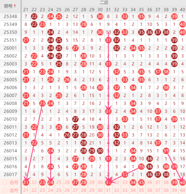 二区间注意打底号是21.22.23.25.30.33.31.35.36.37.中关注3-4码开出机会。