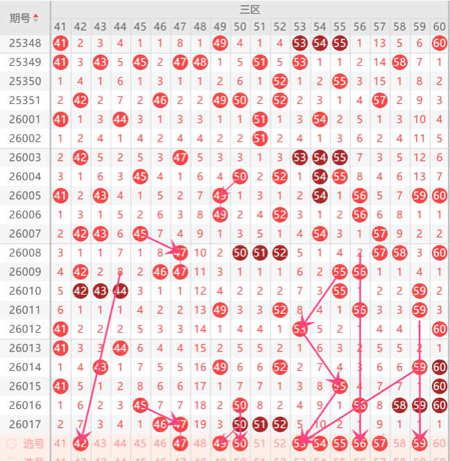 而三区的打底号是41.42.45.46.49.51.52.53.54.56.57.59.60中参考4-5码开出机会,