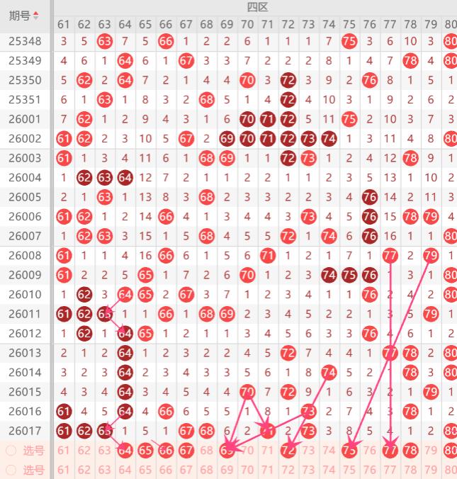 四区在近期的走势上来判断机会的话,整体区间开出走热形态,上期四区间直接爆区开出了8码,而且上期区间开出的形态是重码三连号和空位回补走势,上期小妹在文章布局到了4码开出,那么本期四区间我们重点关注的形态是重码走势,空位回补,对称形态,那么本期首先注意重码走势上的63.62.67.73.80中布局1-2码走重机会,可选择一码订胆,而空位回补上的65.76.75中选择一码回补机会,至于对称形态上注意64.69.76.77.79中布局1-2码开出,那么本期重点关注在重码上布局一码订胆机会,如图所示。