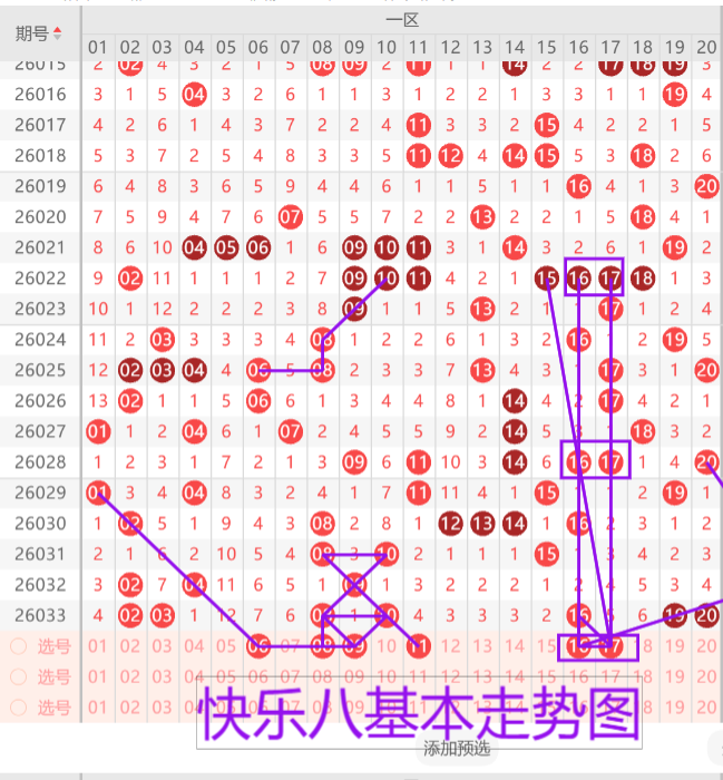 我们来看下一区的基本走势情况,上期开出了七枚开奖号码,本期预计开出4-5枚开奖号码,首先我们来看06的偶数三斜连走势,08 10重号二选一。06 08如图所示同形态可以考虑一起拿。 09夹号复制形态。11的四斜连。可以考虑08 11或者06 09双码。16 17的二连空五对称形态。
