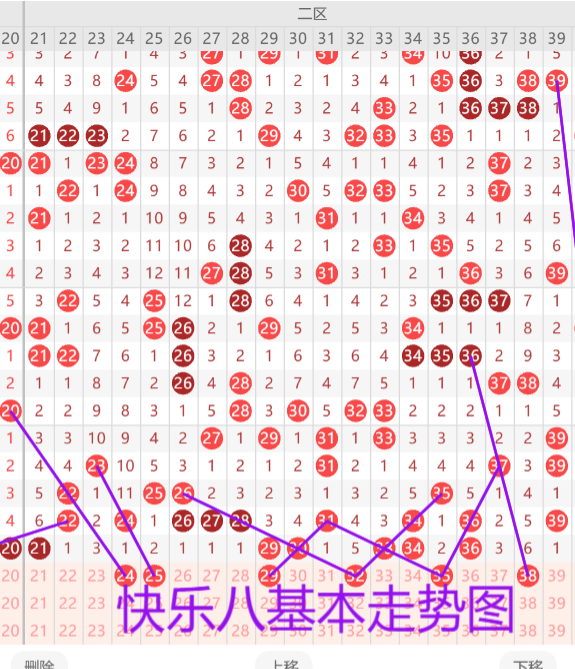 我们来看下二区的基本走势情况,上期开出了五枚开奖号码,本期预计开出4-5枚开奖号码,首先我们来看三斜连的24 25二连走势形态,在这个位置建议回补一枚开奖号码,所以二选一。29 32 35 38四枚间隔二同路走势形态均为三斜连号码,建议四选二或者四选三。