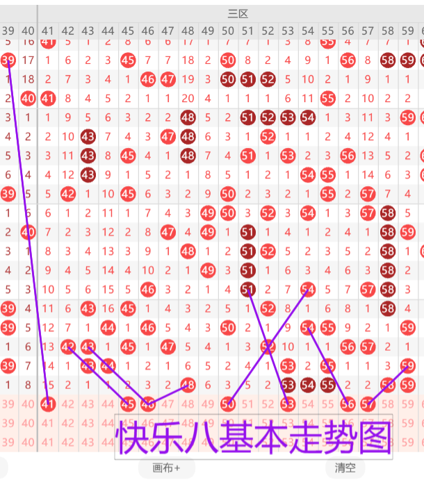 我们来看下三区的基本走势情况,上期开出了六枚开奖号码,本期预计开出了3-4枚开奖号码,首先我们来看41的遗漏15期号码的三斜连建议重点防守。45 46的中间位置回补号建议二选一。50 54的交叉走势建议二选一。56 57的堵漏形态二选一。