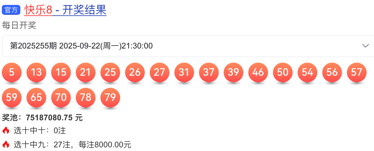 回顾25255期开奖号码:05、13、15、21、25、26、27、31、37、39、46、50、54、56、57、59、65、70、78、79