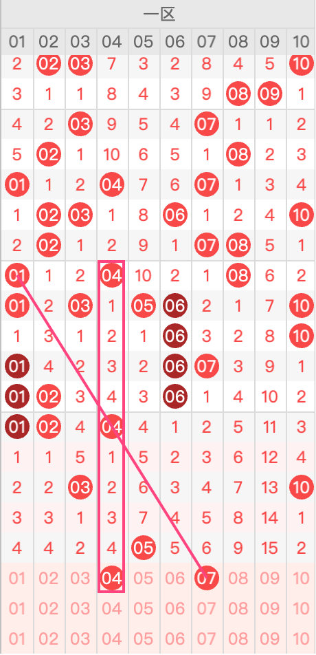 一区经过周期内的调整也是连续开始下降开号数量,由之前大火爆到现在的1个2个左右,这区我们主选4号一个间隔4期的走势,以及副选7号的一个大斜连走势,本期估计会出号2个左右,会慢慢的过渡回火热的区域,一般都是2-3个开始就会走热