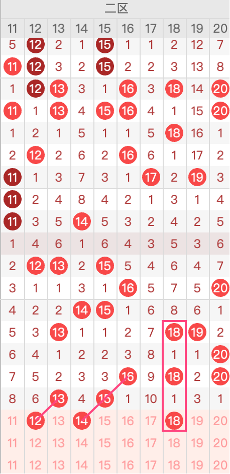 二区最近的走势都是非常低迷的一个情况,这也符合当前走势,因为上两个周期这个区域也是开的异常火爆,但是经过那么多期的沉淀感觉二区的号会慢慢回升,这期这个区域我们主选18号一个单间隔的走势,前门几期都未开出,这期也是大概率会开出该走势,18也是作为本期的金胆,副选14号搭配一个6期的12号,因为近期的分布都是比较散点,个人选号思路就跟着近几期的走势去挑