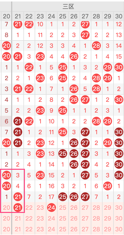 三区上期开出了4个号,不知道这期这个区域会不会继续发光发热,但是经过前几期的火爆后,这就好像一层烟雾弹一样引领大家选这个区,这期我们保守选择,主选21邻号重号,搭配一个冷了17期的24