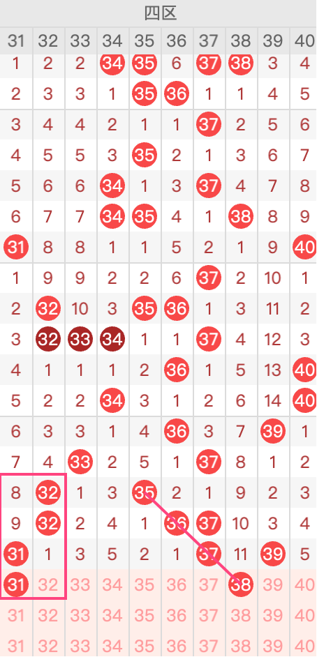 四区一直以来都是比较平淡,很少有5个号起步,都是中规中矩,这期我们保守选择2个号,主选38号一个4斜连的走势,也是11期未开的号,大概率这区会开出,搭配31邻号重号的选择,因为三区的21比31好,31号作为副选