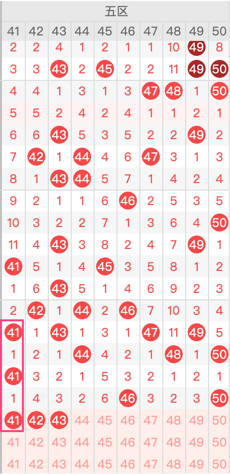五区跟四区一样都是平平淡淡,3-4-3-1-2的走势,但是不会掉到0个,这区我们主选41号,一个单间隔的走势,搭配42、43做一个3连号,近期3连号比较多,有望开出3连的走势