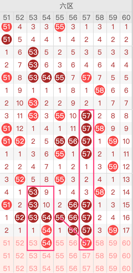 六区上上期开出了一条大连号,继而又开出了4个号,这期这个区大概率还会开出3-4个左右,这区主选54号,53邻号的3重号54号,搭配57号的4重号