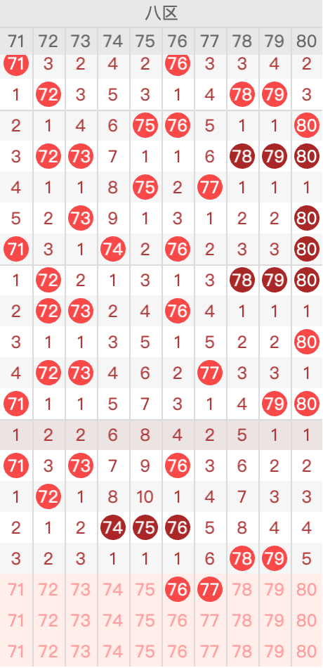 八区上期开出1组二连号,走势比较平淡,这区估计也是2个左右,主选77间隔6期的走势,副选76一个单间隔的走势,做一组二连的选号