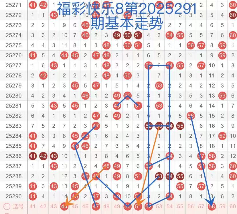 第三区间(41-60):结合近3期第三区开出号码比例7:5:6,预判本期开出号码在5到6个。44号球连续遗漏多期,本期呈交叉断斜连走势,本期看好回补。47.50号球呈三角走势,防守下落1球。51.58号球呈斜跨走势,52号球呈对称菱形回折走势,注意关注。