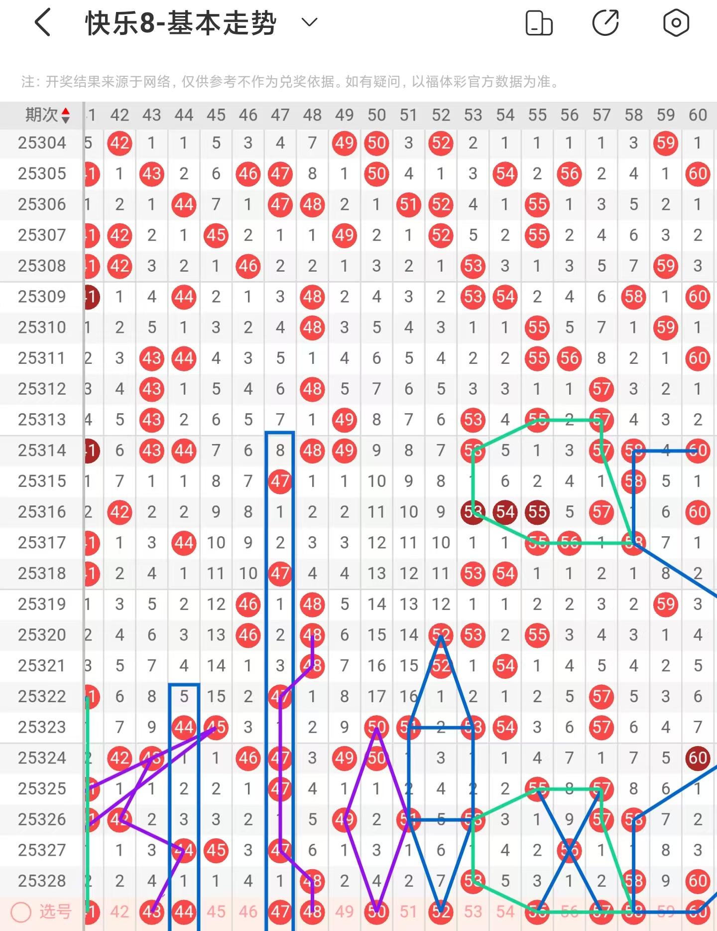 三区间上期稳定落号,一共开出四个号码球,本期考虑增加号码球的数量,注意近期相似形态的42号码球,注意百期相似形态的43号码球,注意隔期递减开出的44号码球,注意42、43、44号码球选择一码回落,本期注意44号码球,注意隔期对称回补的46、48号码球,注意期数和值加减法的47号码球,防守菱形形态的50号码球,注意隔期对称回补的52号码球,以56号码球为交叉中心点,注意分边落号的55、57号码球,注意近期49、53、55、57、58号码球的走势相似,本期注意55、58号码球,以61号码球为对称走势起点,注意走势形态的57、58、60号码球,注意百期内58、60号码球同期下落,下期回补55号码球,因此三区间关注44-46-50-55-60,注意本区间的选二复式46-50-55。