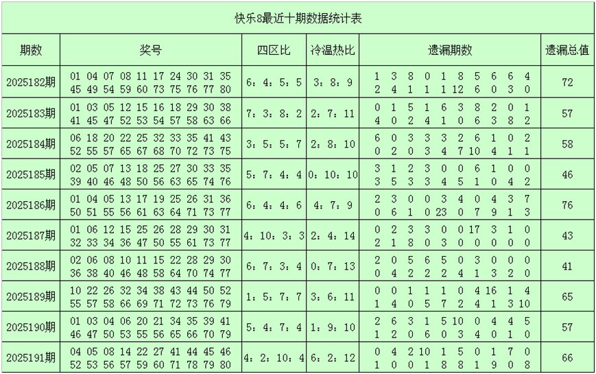 福彩快乐8第2025191期奖号为:04 05 08 14 22 27 41 44 45 46 52 53 56 57 59 60 71 78 79 80,其中奖号和值为901,跨度为76,四区比为4:2:10:4,奇偶比为9:11,遗漏总值为66,奖号冷温热码个数比为6:2:12。