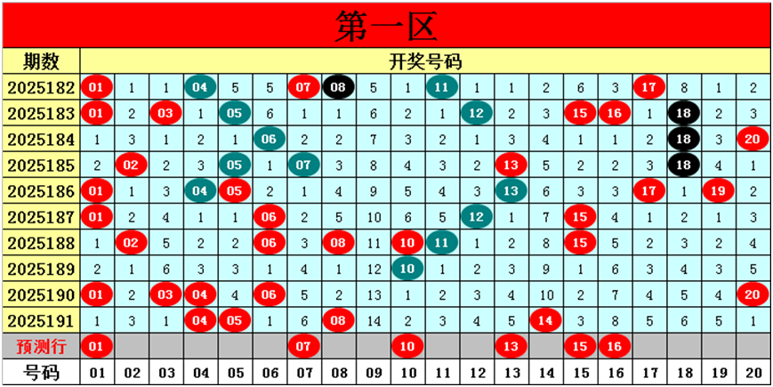 目前第一区包含9个热码:重码4个04、05、08、14,邻码2个03、06,孤码3个01、10、20;包含9个温码:邻码3个07、13、15,孤码6个02、11、12、17、18、19;包含2个冷码:邻码1个09,孤码1个16;号码冷温热个数比为2:9:9,重号、邻码、孤码个数比为4:6:10。