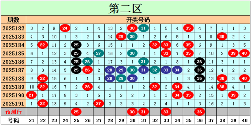 目前第二区包含9个热码:重码2个22、27,邻码2个21、26,孤码5个32、34、35、38、39;包含8个温码:邻码2个28、40,孤码6个25、29、30、31、33、36;包含3个冷码:邻码1个23,孤码2个24、37;号码冷温热个数比为3:8:9,重号、邻码、孤码个数比为2:5:13。