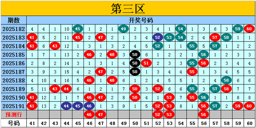 目前第三区包含15个热码:重码10个41、44、45、46、52、53、56、57、59、60,邻码4个43、47、55、58,孤码1个50;包含2个温码:邻码1个51,孤码1个48;包含3个冷码:邻码2个42、54,孤码1个49;号码冷温热个数比为3:2:15,重号、邻码、孤码个数比为10:7:3。