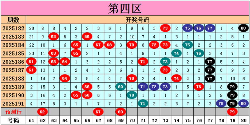目前第四区包含11个热码:重码4个71、78、79、80,邻码2个70、72,孤码5个65、66、69、73、76;包含5个温码:邻码2个61、77,孤码3个63、64、74;包含4个冷码:邻码0个,孤码4个62、67、68、75;号码冷温热个数比为4:5:11,重号、邻码、孤码个数比为4:4:12。