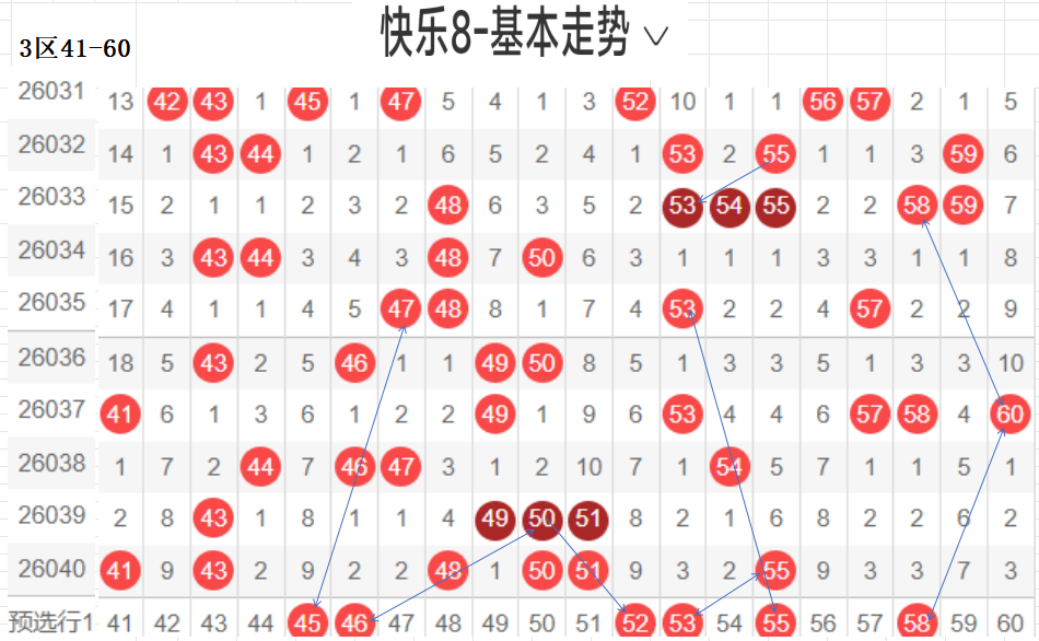三区(41-60):遗漏5期以下有15,041 43 48 50 51 55  6,温开方式,这区码数有回暖之意,可以防一手,先定胆码走势较大者,隔期,斜三连,分边号码,可重防,间隔5以上号码可以随走势选取,例如本期大冷码,走势比较大,可以做胆,通常联动可带出,分边对称的号码,本区间也有很大走势.可关注下.隐形夹角号码.做补位形态号码.都需要观察动态走势.以上是本区间的选码方法.