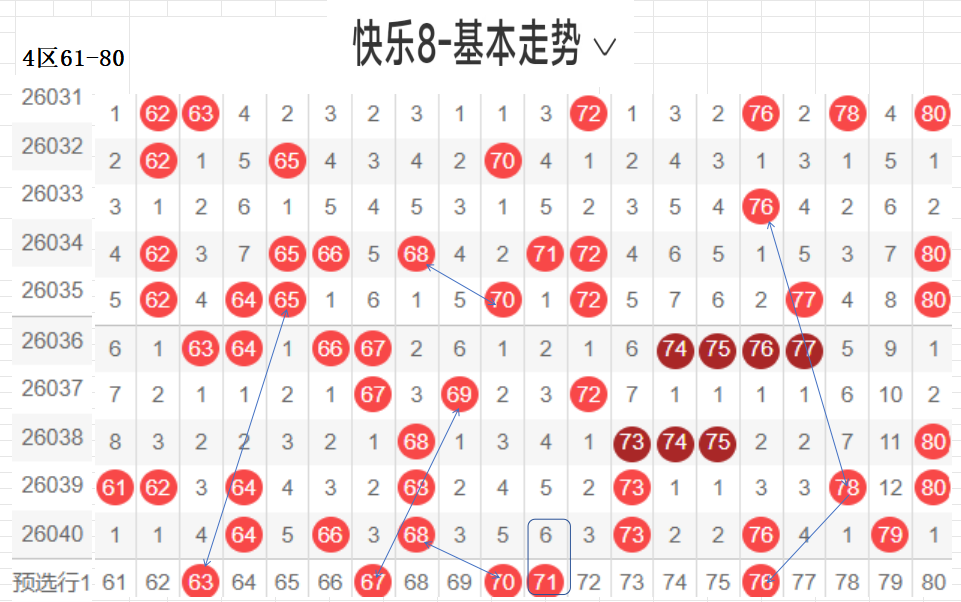 四区:(61-80):遗漏5(5)以下有19,064 66 68 73 76 79  6,平均温开方式,上期开出6,区间回暖,后区可防,区间从以往数据来看,重码很强,一枝独秀的存在,近期有回补走热的趋势,区间回暖,本区间后区可防,与一区相比,也是温区.,对称下落,隔期回补码,可以防,这区对呈对称三角关系的胆码,斜三连有走势的胆码,联动落位码,都有各自的走向落位关系,根据走势选择一种方式选码.