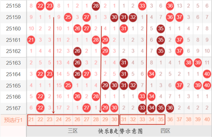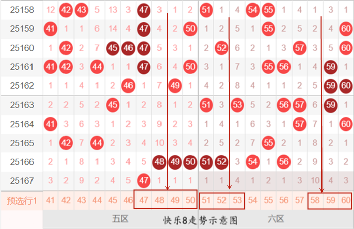 第八区间,上期开出五码,目前此区间处于温热状态,根据走势分析预计本期此区间将分散开号,预计将继续出现走热趋势。