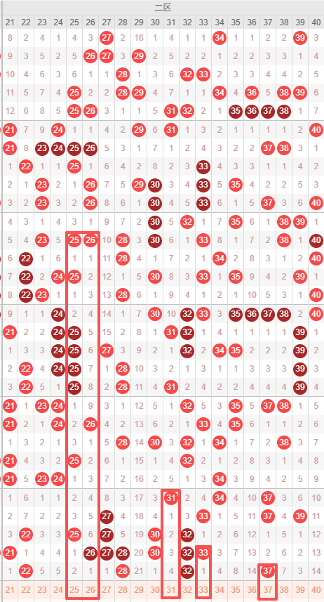 二区:最近二区10期出号情况为:7 5 5 3 4 3 4 5 7 4,总出号情况为47个,平均出号4.7个,本期二区号码推荐:25 26 31 33 37。重点关注:25 31 33 37。