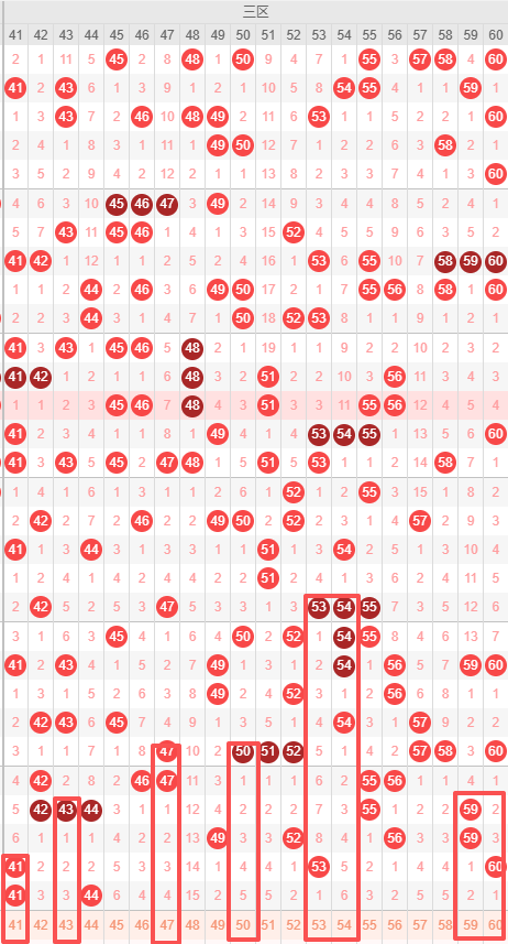三区:最近三区10期出号情况为:5 7 2 5 7 5 5 4 3 2,总出号情况为43个,平均出号4.3个,本期三区号码走势推荐:41 43 47 50 53 54 59 60,重点关注:43 47 50 54 59 60。