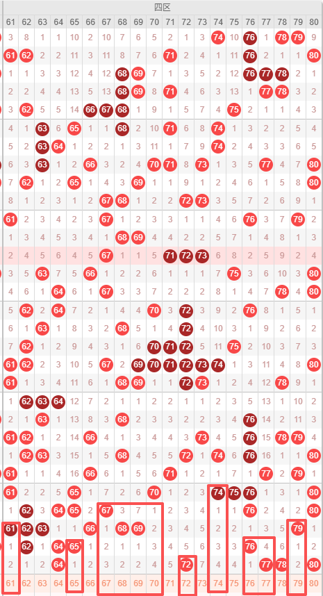 四区:最近四区10期出号情况为:3 3 7 7 5 7 6 7 4 5,总出号情况为54个,平均出号5.4个,本期四区号码推荐:61 65 67 68 69 70 72 74 76 77 79,重点关注:65 70 74 77 79。