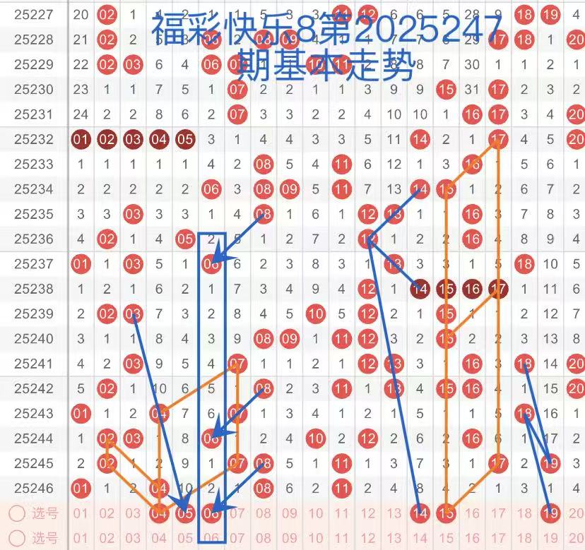 下面是我对2025247期福彩快乐8的分析和预判,希望通过我的分析能让大家今晚大满贯!福彩快乐8上期开奖号码如下图