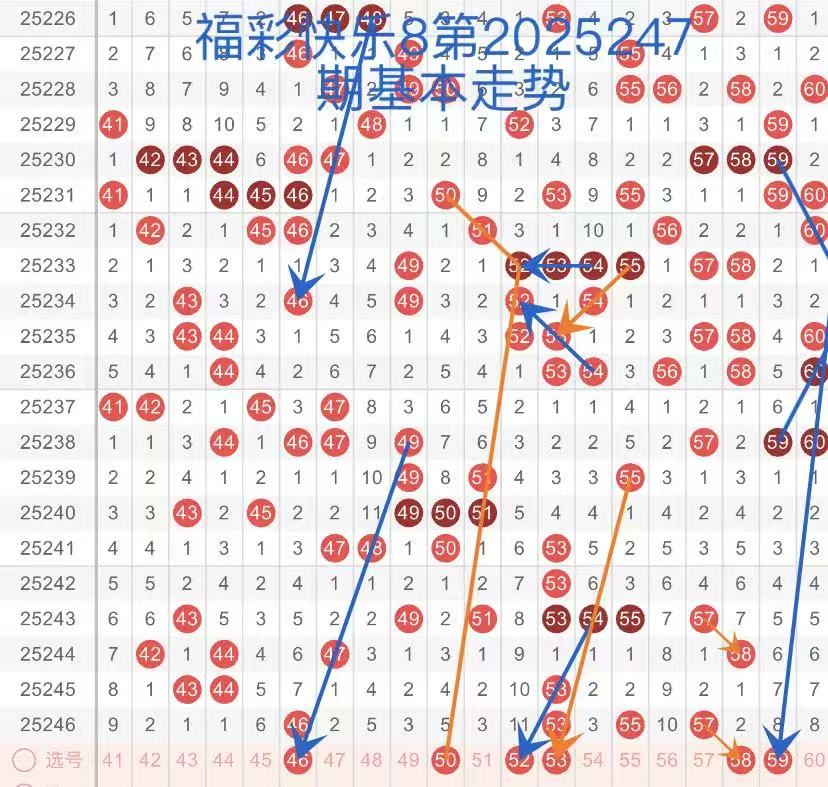 第三区间(41-60):结合近3期第三区开出号码比例4:3:4,预判本期开出号码在4到5个。46号球呈斜跨走势,注意关注。50号球呈三角回折形态,52号球同样呈斜跨走势,连续遗漏多期注意防守。53号球呈斜跨走态,看好继续走重落号。58号球在上期开出57号球的联动下注意关注。59号球呈三角回折走势,注意防守。
