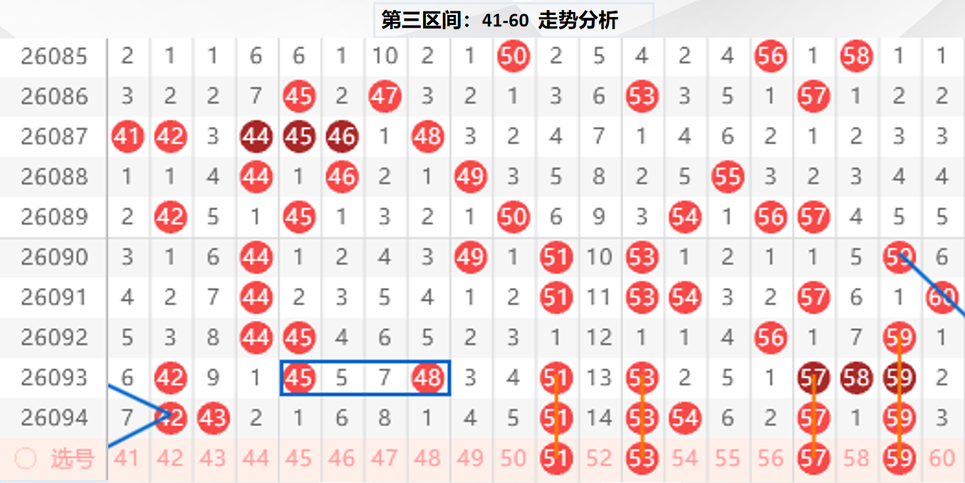 三区分析:【41-60】(走势图标注号码非小黄车大底,请谨慎参考,具体思路将在直播间分享讨论)