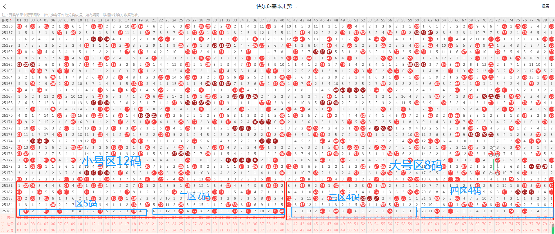 上图是快乐八2025185期区间走势图,从图中看到小号区(1-40)开出12个出奖号码,本期与上期开出数量增加,热度偏温,从小号区近10期出号情况看,整体小号区前区近期偏温趋势;大号区(41-80)本期开出了8个出奖号码,从近期出奖号码个数看属于偏温态势,下期快乐八20250186期小号区号码大概率热度回补,大小区间主看小区号码回补,大小比具体区间比可参考10:10,防9:11比例;再从细分区间判断,分成四个区间,一区(1-20)开出来的号码有5个;二区(21-40)开出来的号码有7个;三区(41-60)开出来的号码有4个;四区(61-80)开出来的号码有4个;数据上看本期出奖号码集中分布在四区。从号码落位区间形态上看,快乐八20250186期主看二、三区热度回补的态势,出奖号码几率较大,需要密切关注。