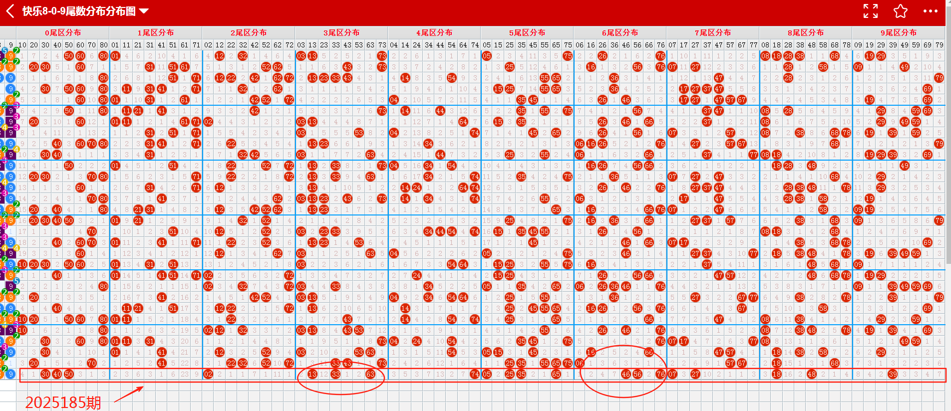 上图是快乐八2025185期的尾码走势图,从图中看0尾到9尾出号个数依次是:0尾号码区开出3个;1尾号码区开出0个;2尾号码区开出1个;3尾号码区开出3个;4尾号码区开出1个;5尾号码区开出4个;6尾号码区开出3个;7尾号码区开出2个;8尾号码区开出2个;9尾号码区开出1个;再看小尾号码(0尾-4尾)区有8码,大尾号有12码;数据比对统计后可以看到5尾出号数量最多,开出了4个中奖号码。本期1出现断区!由走势比对推断20250186期重点需要关注3、6尾区号码下号热度和增加的概率较大。