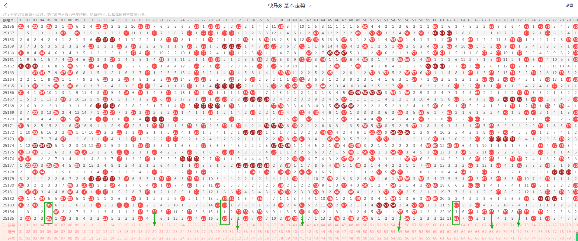 从这张走势图可以看到我画标出来了遗漏示意号码,隔期(遗漏一期的)3个号码(绿色方块标示的),从近期走势图看隔期有走热态势,本期判断6个(绿色箭头标示的:20、32、41、55、68、72)需要关注,有下号概率;